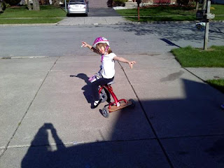Today, I shabbily attached the training wheels and Madeline got to try out her new ride this afternoon. Despite having the training wheels on, I still needed to help Madeline out. And, as the test drive continued she seemed to get a little wobblier. I am not sure if that is because Madeline was starting to realize that she could potentially fall or if my shabby job of attaching the training wheels was starting to effect her. The later is probably more the case since after a couple spins up and down the street, the wheels were hardly touching the ground. The new unsteady ride eventually had Madeline revert back to her comfort level on the tricycle for the rest of the afternoon. However, I am proud of Madeline's good try on her first go on a big girl's bike.I